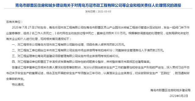 3月3日,青島市即墨區(qū)住房和城鄉(xiāng)建設(shè)局發(fā)布于對(duì)青島方冠市政工程有限公司等企業(yè)和相關(guān)責(zé)任人處理情況的通報(bào)。通報(bào)稱,2020 年 7 月 27 日17時(shí)左右,青島方冠市政工程有限公司在青島市即墨區(qū)靈山產(chǎn)業(yè)園污水轉(zhuǎn)輸工程進(jìn)行管道水壓試驗(yàn)時(shí),發(fā)生一起閥門井下作業(yè)窒息事故,造成 2 名工作人員死亡,1 名村民在主動(dòng)施救過(guò)程中死亡,直接經(jīng)濟(jì)損失 333 萬(wàn)元。根據(jù)事故調(diào)查組的處理意見(jiàn),經(jīng)我局研究決定對(duì)有關(guān)企業(yè)和個(gè)人進(jìn)行處理,現(xiàn)將相關(guān)情況通報(bào)如下: