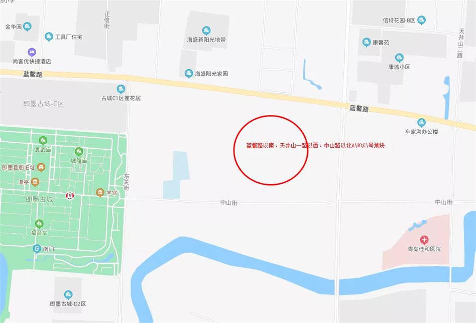 即墨潮海街道藍鰲路以南、天井山一路以西、鏡镕街以東、中山街以北A\B\C\D四個地塊大致位置。
