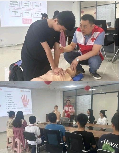 在理論講解環(huán)節(jié),紅十字會的老師憑借豐富的專業(yè)知識和教學經(jīng)驗,用簡潔明了的語言系統(tǒng)講解了應急救護的基礎知識。從如何快速判斷現(xiàn)場環(huán)境安全性、識別傷者意識與呼吸狀態(tài),再到進行胸外按壓和人工呼吸,每一個步驟都講解得清晰透徹,并結(jié)合實際案例,讓同學們直觀感受到“黃金急救時間”的重要性,深刻理解掌握急救技能的必要性。