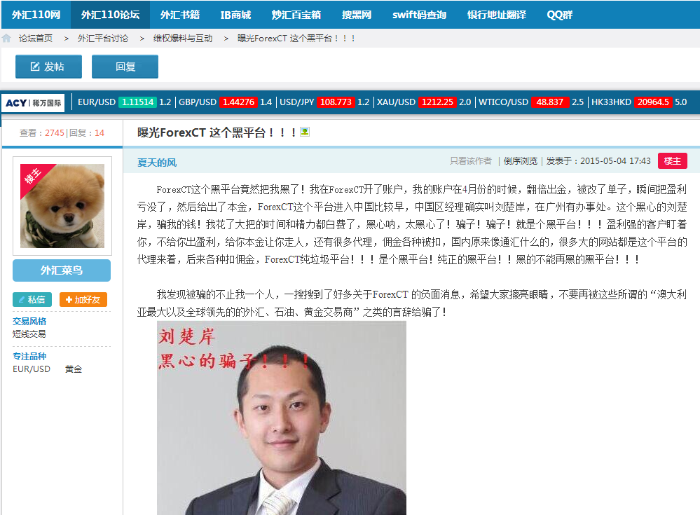 查看劉楚岸個人資料的時候,把劉楚岸寫的很牛的,F(xiàn)orexCT亞洲區(qū)總經(jīng)理,首席外匯金融策略師。具有逾越10年的外匯金融出資生意經(jīng)歷,曾上任于澳洲出名銀行以及世界出名金融生意商,一同持有世界注冊金融剖析師和澳大利亞注冊金融理財師執(zhí)照,特別是對澳元走勢有著精準(zhǔn)的見地和剖析。這些年在澳大利亞各大城市以及我國等亞太國家舉辦多場專題外匯金融講座,深得出資者好評。簡直就像外匯金融市場神一樣的存在,差點就被洗腦家人劉楚岸崇拜的腦殘粉一族了,還好我保持理智又接著往下看更多關(guān)于劉楚岸及ForexCT的信息。頓然看到了許多關(guān)于劉楚岸及ForexCT的負(fù)面消息,有客戶爆料該平臺是對賭平臺,還有的說是黑平臺,客戶只有紙面利潤,如果你盈利很多想要出金,平臺總是給你找各種理由,延遲不給出金,好多人就只好再繼續(xù)做單,但仍然只是紙面資金,不能夠成為現(xiàn)實財富,導(dǎo)致許多客戶沒有心情集中精神進行做單,開始虧錢,到最后自己的本錢只能一半的時候不得己選擇出金,這時候ForexCT才同意出金,客戶到現(xiàn)在都不明白自己之前賺的錢是賺國際外匯市場中的錢還是ForexCT公司自己內(nèi)部的錢,虧損的本金到底虧給了外匯國際市場還是ForexCT公司自己腰包里,不單是一個客戶反映有此疑問,很多客戶都反映有此問題,在國內(nèi)外匯值得用戶信任的外匯110網(wǎng)上也同樣有客戶爆料劉楚岸及ForexCT,有圖有真相