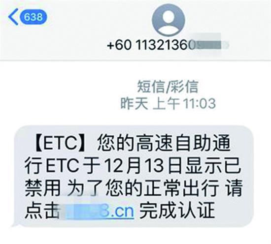 11月11日,市民張先生收到一條短信,提示ETC認證已失效,點擊短信內(nèi)附帶的鏈接認證后就可以正常使用。張先生按提示打開鏈接,依次輸入身份證號、手機號、短信驗證碼等關(guān)鍵信息。20分鐘左右,他收到了銀行發(fā)來的取款短信,方知自己被騙,隨即報警。