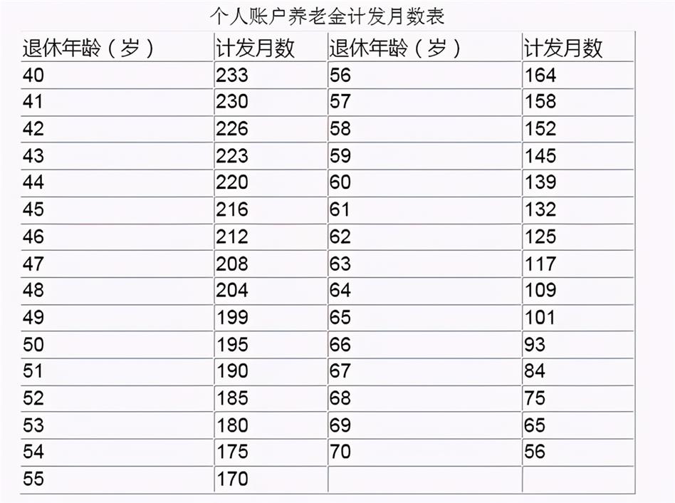 目前的個人賬戶計發(fā)月數(shù)表規(guī)定是,60歲退休對應的計發(fā)月數(shù)是139個月,55歲退休對應的是170個月,50歲退休對應的是195個月。