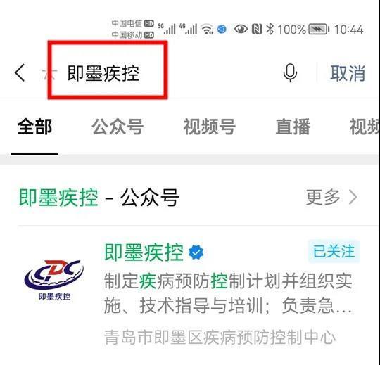 1、關(guān)注“即墨疾控”微信公眾號(hào)。