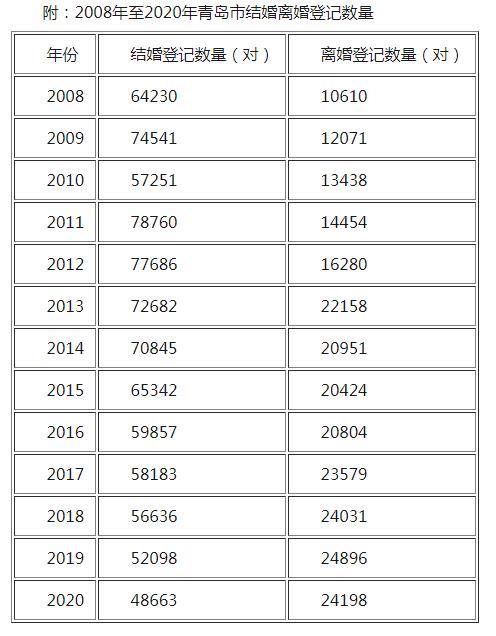 結(jié)婚登記數(shù)量十年連降,降幅達38% 記者從青島市民政局了解到,2021年1月1日至6月30日,青島市結(jié)婚登記數(shù)量為24609對,這一數(shù)量比去年同期略有增多。不過,由于去年上半年疫情原因,對婚姻登記數(shù)量必然會造成一定影響,因此并不具有比較意義。而去年全年青島市結(jié)婚登記數(shù)量為48663對,從2011年以來已連續(xù)十年下降。