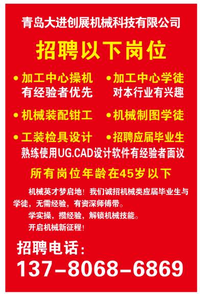 機(jī)械裝配鉗工·機(jī)械制圖學(xué)徒工裝檢具設(shè)計(jì)·招聘應(yīng)屆畢業(yè)生熟練使用UG.CAD設(shè)計(jì)軟件有經(jīng)驗(yàn)者面議所有崗位年齡在45歲以下機(jī)械英才夢(mèng)啟地!我們誠(chéng)招機(jī)械類(lèi)應(yīng)屆畢業(yè)生與學(xué)徒,無(wú)需經(jīng)驗(yàn),有資深師傅帶。