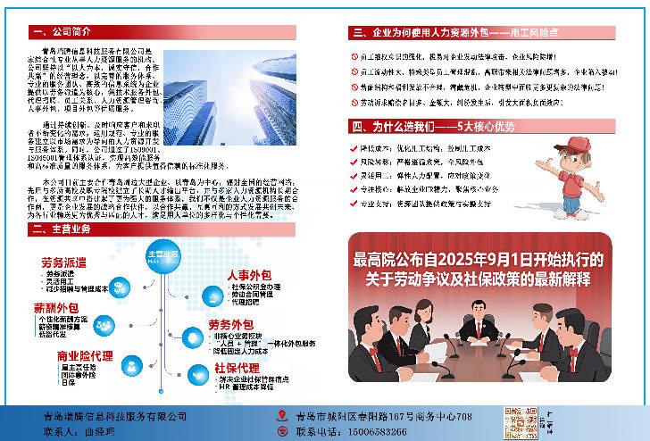 青島瑞騰信息科技服務(wù)有限公司是一家綜合性專業(yè)從事人力資源服務(wù)的機(jī)構(gòu)。公司堅(jiān)持以“以人為本,誠實(shí)守信,合作共贏”的經(jīng)營理念,以完善的服務(wù)體系、專業(yè)的服務(wù)團(tuán)隊(duì)、高效的信息系統(tǒng)為企業(yè)提供以勞務(wù)派遣為核心,集技術(shù)服務(wù)外包、代理招聘、員工關(guān)系、人力資源管理咨詢、人事外包、項(xiàng)目外包等優(yōu)質(zhì)服務(wù)。