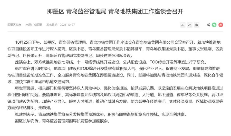 即墨區(qū)青島藍谷管理局 青島地鐵集團工作座談會召開
